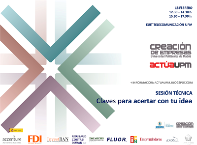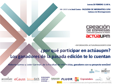 Ciclo de presentaciones X Competición actúaupm Si quieres realizar una sesión sobre creación de empresas o comercialización en tu escuela, grupo o asignatura, por favor contacta con nosotros en creacion.empresas@upm.es El viernes 1 de marzo a las 12:30, en Claustro…