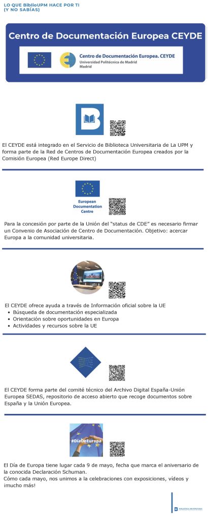 El CEYDE está integrado en el Servicio de Biblioteca Universitaria de La UPM y forma parte de la Red de Centros de Documentación Europea creados por la Comisión Europea (Red Europe Direct).