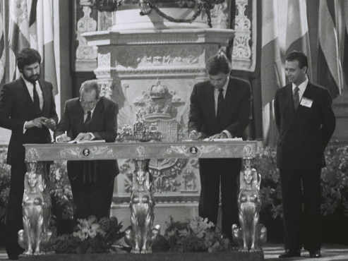 El 12 de junio de 1985 España firmó en el Salón de Columnas del Palacio Real de Madrid el Acta de Adhesión a las Comunidades Europeas, junto con Portugal. La firma se llevó a cabo después de 8 años de negociaciones, iniciadas en 1977.