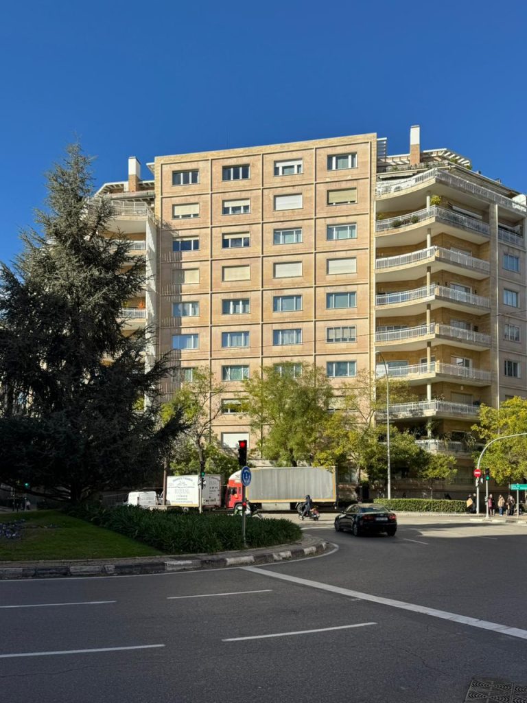 Lo que más me llama la atención del edificio de la Glorieta de Rubén Darío 2 es cómo resuelve su presencia en un punto tan visible mediante una composición muy ordenada, casi serena, que combina una fachada plana y regular en el frente principal con un tratamiento completamente distinto en los laterales. La parte frontal, que mira directamente hacia la glorieta, se organiza con una retícula muy clara: y esta fachada funciona como un plano homogéneo en el que se incrustan ventanas perfectamente alineadas, creando un ritmo constante que ayuda a dar estabilidad y proporción al conjunto. Esa fachada funciona casi como un telón urbano, una pieza muy contenida que no quiere competir con la complejidad del entorno sino aportar claridad visual. En cambio, los laterales se abren en terrazas y elementos verticales que las conectan y que contrastan con la rigidez del plano central y aportan dinamismo; esa diferencia entre un frente más formal y dos costados más abiertos me recuerda lo que veíamos en clase sobre la forma cerrada frente a la forma abierta, y cómo un edificio puede combinar ambas estrategias dependiendo de su relación con el contexto. Las terrazas, curvas y muy expuestas, permiten que el edificio se adapte mejor al giro de la glorieta y suavizan la esquina, generando una transición más amable entre el volumen contundente y el espacio urbano. Además, la alternancia entre el ladrillo plano y los volúmenes salientes de las terrazas produce una lectura doble: por un lado, una fachada disciplinada y muy geométrica; por otro, una piel habitada, con balcones y barandillas, que introduce profundidad, sombra y variedad. En conjunto, el edificio equilibra muy bien su función residencial con su posición estratégica, usando una composición clara, ordenada y a la vez flexible, que le permite ser reconocible sin necesidad de gestos llamativos.