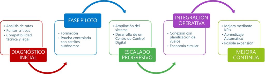 El impacto del proyecto se medirá mediante indicadores clave como la reducción del tiempo de handling por ULD, la mejora en la seguridad laboral, la disminución de emisiones y consumo energético, el aumento en la reutilización de componentes, la satisfacción de operarios y clientes, y la disponibilidad y eficiencia operativa de la flota autónoma.
