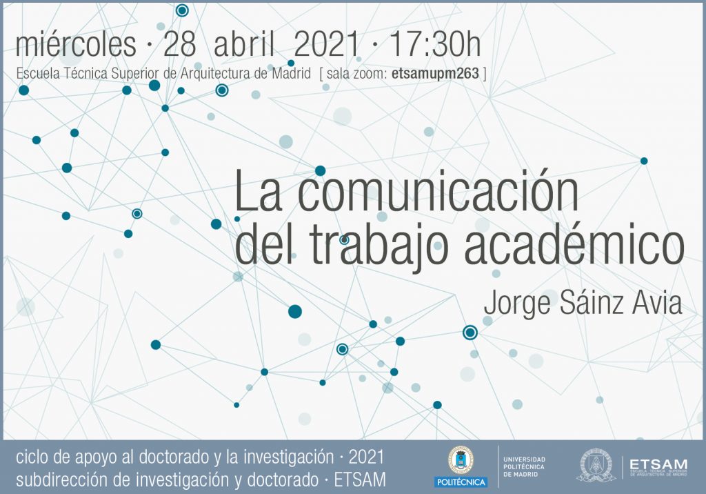 Título: La comunicación del trabajo académico Ponentes: Jorge Sáinz Avia Fecha y hora: Miércoles 28 de abril, 17:30(duración aprox. 90 min.) Sala Zoom: etsamupm263