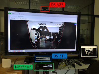 Different sensors have been jointly displayed at the same computer using one large monitor with the aim of making test of different research lines of this group. This setup has been mainly thank for testing different research solutions related to Human-Machine Interaction using different sensors that combines color and depth information.