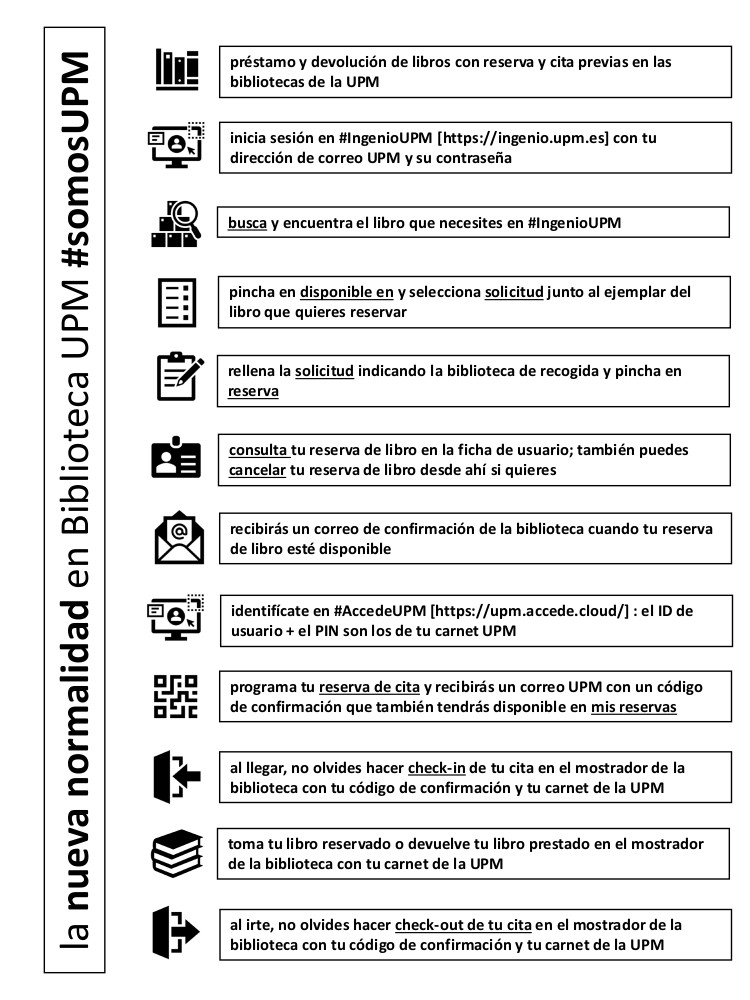 A partir de ahora, si necesitas algún libro de nuestra Biblioteca, haz la solicitud en IngenioUPM. Cuando el libro esté disponible, te enviaremos un e.mail para comunicártelo. Reserva cita en AccedeUPM antes de venir a recogerlo y recibirás otro correo con el CÓDIGO QR DE CONFIRMACIÓN de la cita. Al llegar, pasa el código QR por el lector. Haz lo mismo a la salida.
