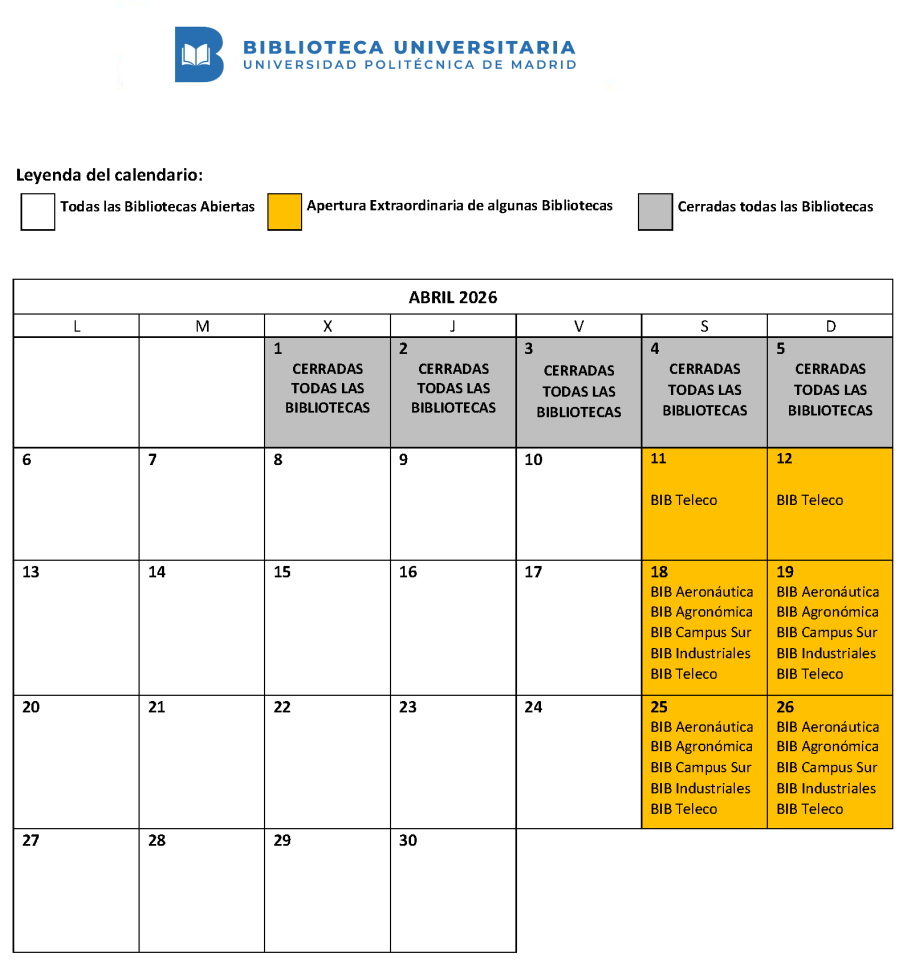 Bibliotecas UPM abiertas Fines de Semana y Festivos de Abril