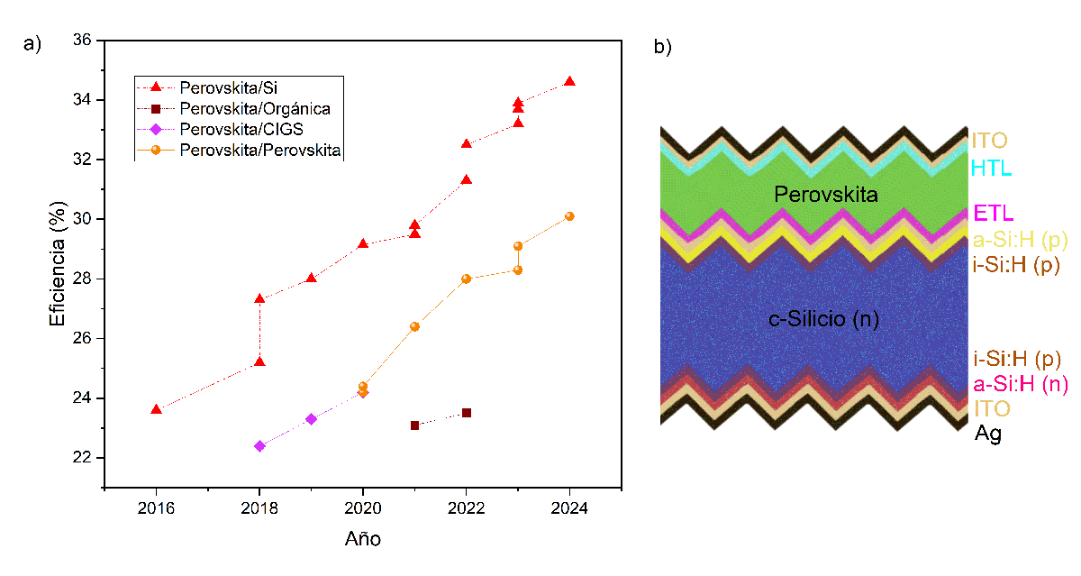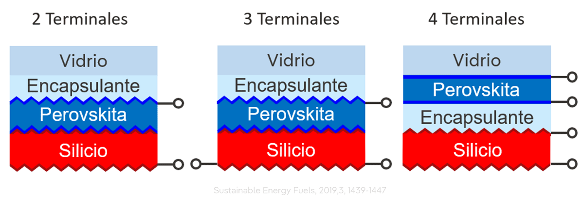 Since their emergence in 2009, perovskites have undergone numerous optimizations in device architectures which have been incorporated in other technologies , including solar cells with mesoporous [1] and planar layers [2], as well as multilayer devices known as tandem cells [3]. The concept of using three or four semiconductors with different bandgaps to absorb a broad range of the solar spectrum—from ultraviolet to far-infrared—is not exclusive to multi-junction devices. Tandem architectures with materials of differing properties, known as hybrid tandems, have shown a better efficiency-to-cost ratio compared to III-V multi-junction cells [4]. This is where tandem perovskite cells play a pivotal role. Various configurations have been explored, including thin-film semiconductor cells made of Copper-Indium-Gallium-Selenide (CIGS), Cadmium Telluride (CdTe), organic photovoltaic (OPV) cells, and silicon cells [5,6] (Figure 1a). Among these, textured architectures combining perovskite and monocrystalline silicon heterojunctions (Figure 1b) have demonstrated the highest certified efficiencies for small devices (<1 cm²), achieving 24% in 2017 and 33.9% in 2024 [7]. What configuration has enabled such high efficiencies? Tandem perovskite architectures are divided into three families based on the number of output connections in the photovoltaic device. The most efficient cells to date are known as two-terminal (2T) cells (Figure 2). These devices operate like two cells in series, with their constituent layers fabricated one atop the other on a single substrate. Optimization efforts for these cells have primarily focused on coupling the individual currents of each sub-cell and passivating the interfaces between constituent materials. Other tandem perovskite device options include three-terminal (3T) and four-terminal (4T) architectures, the latter being the easiest to fabricate since each cell can be fabricated separately and then stacked using an encapsulant or adhesive. However, these devices are generally less efficient than 2T cells because radiation can be lost through reflection and/or absorption at the interface between individual cells. For 3T cells, they show the greatest potential for efficiency improvements. Simulations indicate these devices could achieve efficiencies close to 40%, without relying heavily on the bandgap of the perovskite material used [8]. Additionally, complementary studies have focused on designing electrical connections between the cells, paving the way for the production of large-format panels and ensuring their commercial viability in the coming years.