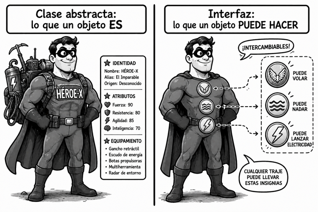 📎 Nota: la combinación INTERFAZ + CLASE ABSTRACTA esquelética es un patrón especialmente potente que merece explicación detallada. Lo desarrollaremos en un artículo posterior.