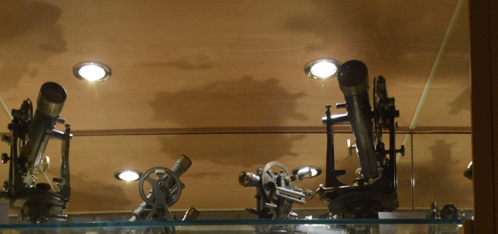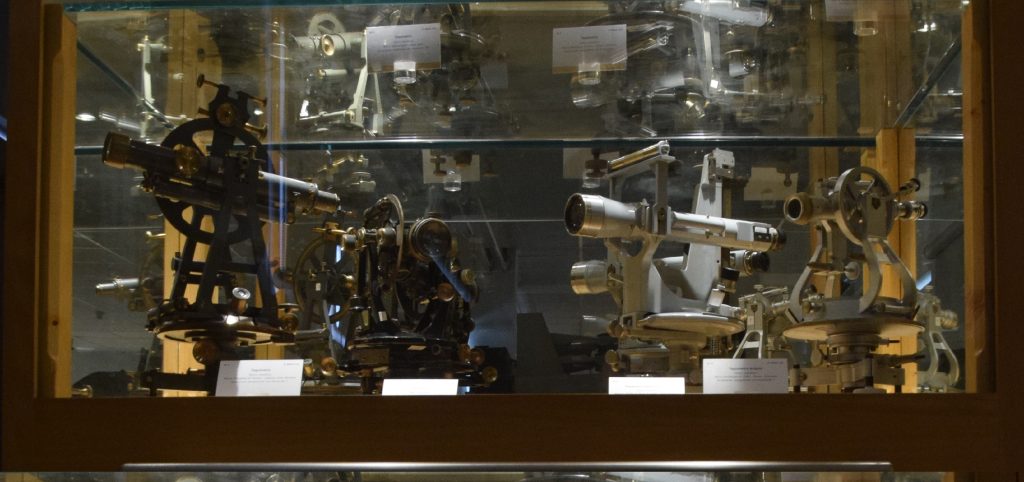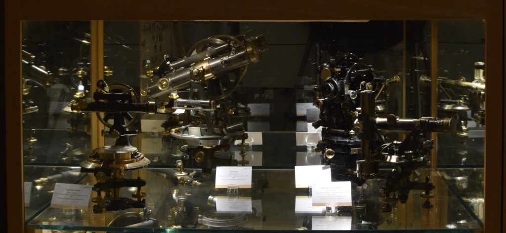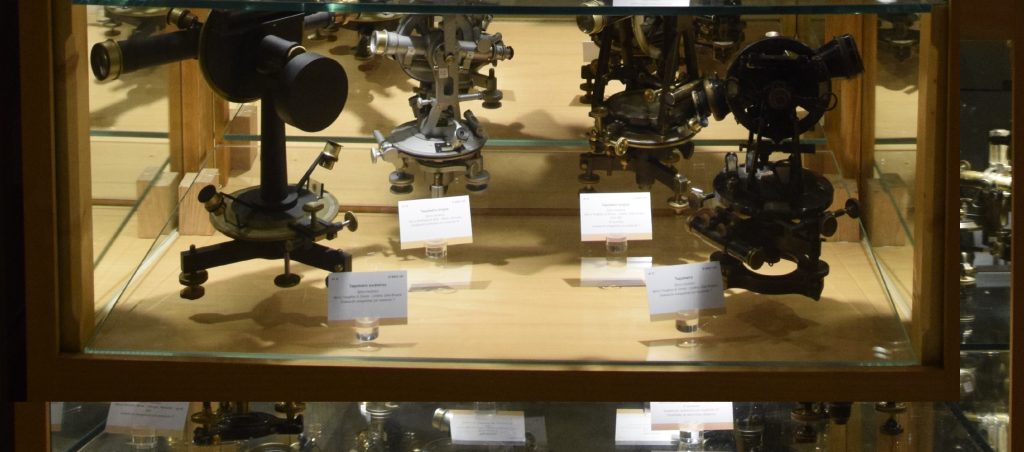 En esta vitrina se exhiben diversos taquímetros utilizados entre finales del siglo XIX y 1920. La mayoría cuentan con una resolución de 1 minuto de arco o 1 centesimal, según las unidades de medida empleadas, tanto en los limbos horizontales como en los verticales.