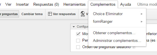 Para utilizarlos, es muy sencillo, dentro de la página de edición de nuestro formulario, existe una opción en el menú "Complementos". Desde esta opción podemos activar o desactivar los complementos que ya hemos instalado o instalar alguno nuevo: