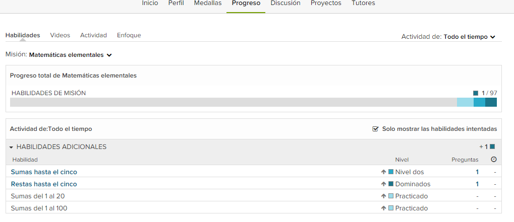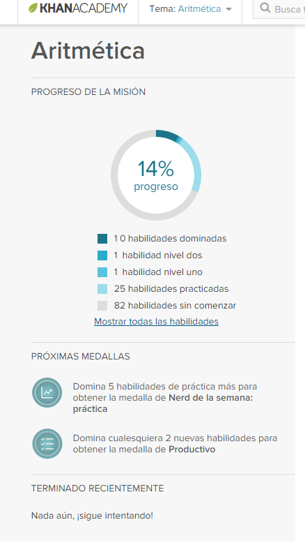 Otro elemento característico de la gamificación es el progreso, que permite ver al estudiante cómo es su evolución, encontramos barras de progreso en diferentes ubicaciones dentro de la Khan Academy: