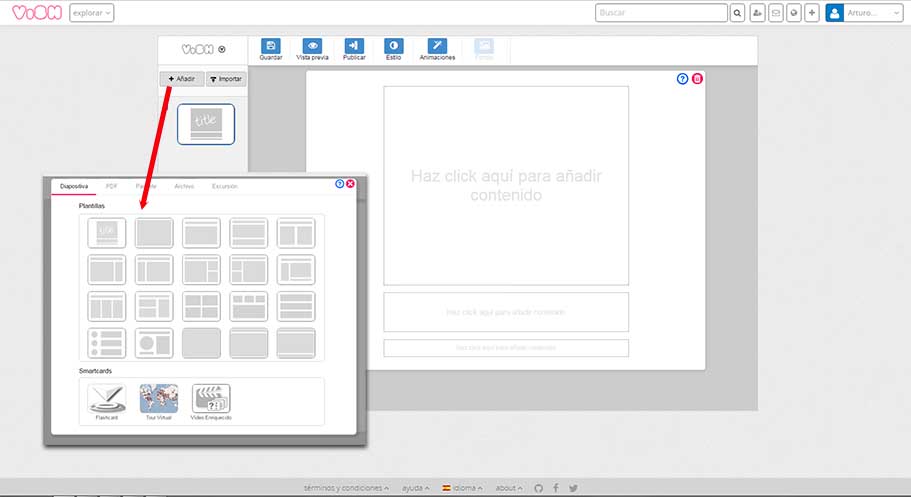 Para crear contenido, el primer paso es registrarse y ya podemos empezar a modelar nuestras presentaciones. El funcionamiento es bastante sencillo e intuitivo. Empezaremos por crear una nueva "excursión". Le daremos un nombre y completaremos toda la información que queramos. Podemos elegir el tipo de licencia, escoger metadatos y categorizar nuestro contenido, así como controlar las opciones de publicación (permitir descarga, comentarios y clonación de nuestra excursión). Elegiremos una apariencia de las propuestas y ya se puede comenzar a incorporar contenido.