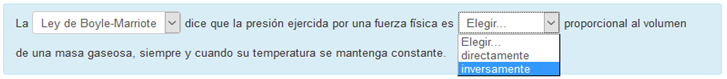 Seleccionar palabras faltantes. Dentro de un texto aparecen huecos con menús desplegables, donde se debe seleccionar la opción correcta. Es similar a una pregunta de tipo Cloze compuesta de preguntas de opción múltiple.