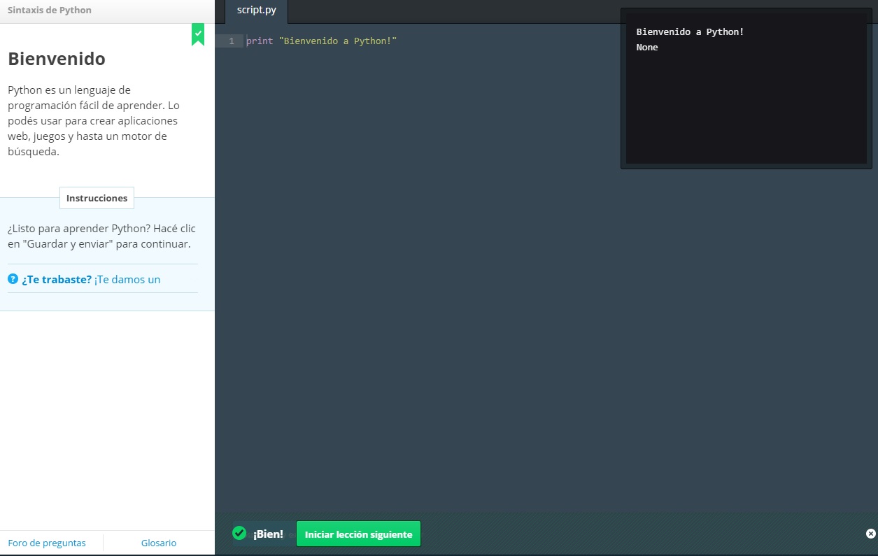 Una vez dentro del curso veremos el porcentaje que llevamos superado (por curso y por unidad) y las diferentes unidades. Cada unidad está formada por una serie de lecciones que se basan en ejercicios (uno por lección) con un enunciado y una explicación teórica previa asociada con el ejercicio. Dispondremos de un terminal (Fig. 1) en el que escribir el código que se nos pida, una vez completado el ejercicio podremos pulsar en "guardar y enviar" para comprobar si lo hemos realizado de manera correcta, apareciendo el resultado que se vería por pantalla en un cuadro a la derecha (en el caso de equivocarnos saldrá el mensaje de error que aparecería en un terminal). El sistema nos indicará si el ejercicio está correcto o si por el contrario debemos revisarlo, aportando información de ayuda, y según el ejercicio un enlace a más información.