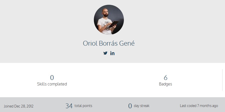 Codecademu cuenta con un perfil que se puede hacer público (Fig. 2) o permanecer privado, con la opción de añadir enlace a la web personal, redes sociales y a GitHub, red social de programadores formada por código fuente, muy útil a la hora de darnos visibilidad y mostrar nuestros trabajos, y con más sentido en esta red donde todos los resultados académicos serán código que podremos compartir en dicha red.