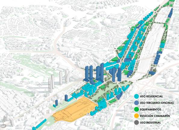 Podemos considerar como centro o eje de este proyecto la actual estación de Chamartín, que estará acompañada por un distrito dedicado a los negocios y 11.000 de las cuales el 20% seria vivienda protegida.