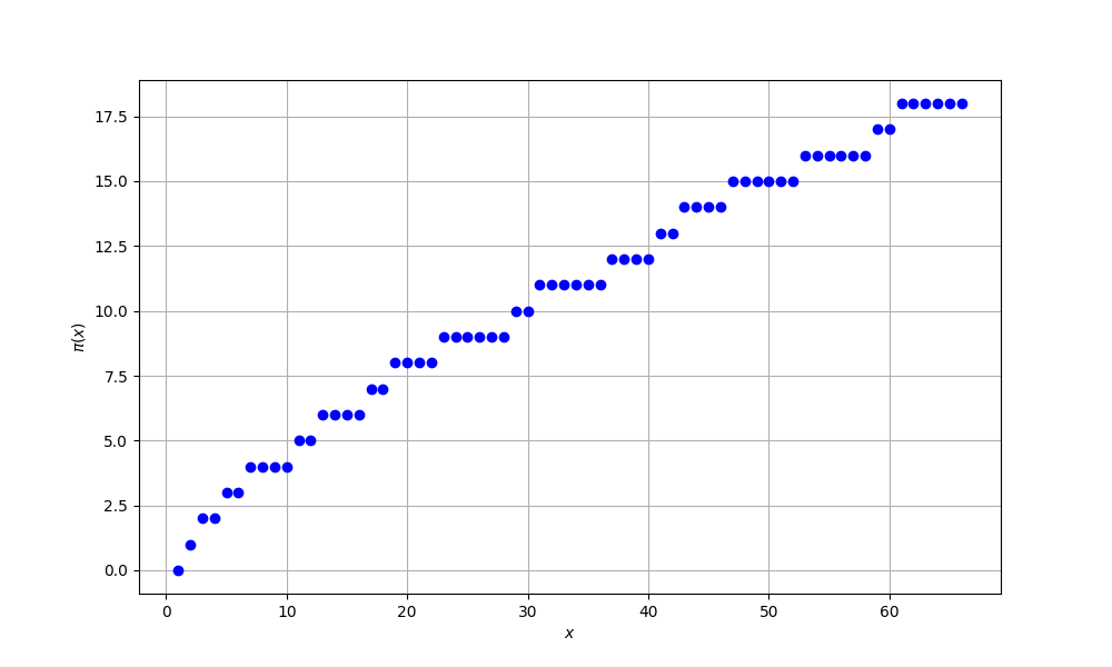 La Figura 18 representa la gráfica de \pi(x). Como se puede comprobar, es una función constante a trozos, y se produce un salto de una unidad cada vez que x es un número primo.