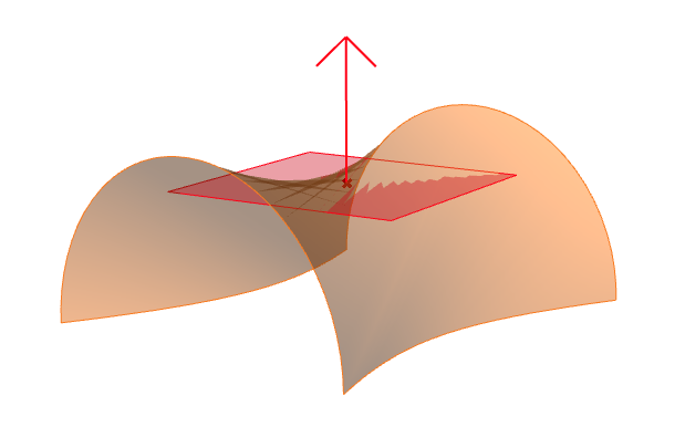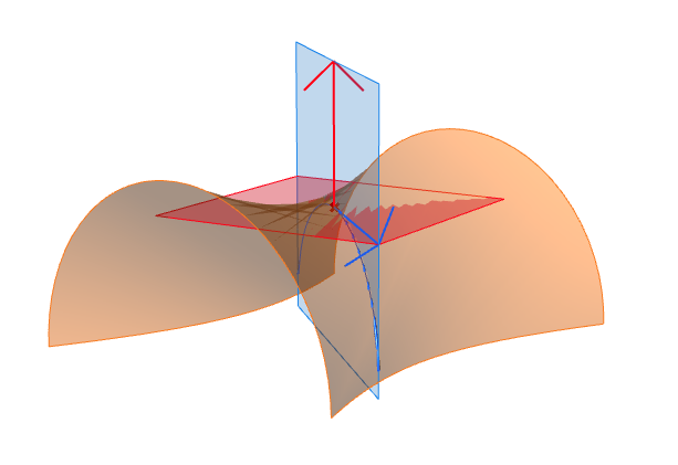 Consideramos ahora una superficie S y un punto P de la misma. En dicho punto, observamos el vector perpendicular y el plano tangente a la superficie (vector rojo y plano rojo en la figura 21). Fijado un vector \mathbf{v} del plano tangente (vector azul en la figura 22), construimos el plano que contiene a P y que está generado por el vector del plano tangente \mathbf{v} y el vector perpendicular (vector rojo en la figura 22). Dicho plano interseca a la superficie en una curva C (en azul), llamada sección normal, y calculamos la curvatura de dicha curva en el punto P (inverso del radio de la correspondiente circunferencia osculatriz), asignando un signo a la curvatura en función de como está situada la circunferencia osculatriz respecto del plano tangente a la superficie. A la curvatura con signo así calculada la denominamos curvatura normal de S en P en la dirección del vector \mathbf{v}.