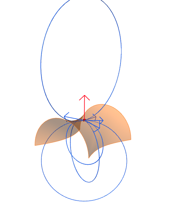 Repetimos la operación para distintos vectores tangentes a la superficie (Figura 23) y de todas las posibles curvaturas normales, seleccionamos la máxima y la mínima, \kappa_{max} y \kappa_{min}, denominadas curvaturas principales (se corresponden con las curvaturas de las circunferencias azules en la figura 24). Las curvaturas principales recogen la información