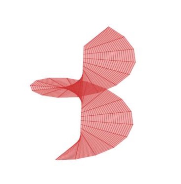 Pensando en el proceso constructivo de una superficie reglada, el que esta sea desarrollable o no tiene una implicación directa en cómo están metidas las generatrices en la superficie. Idealmente una recta no tiene grosor, pero al materializarla adquiere cierto grosor. Si consideramos bandas a lo largo de cada generatriz cuyos lados extremos son los vectores normales en los extremos de la generatriz, observamos que dicha banda es plana o no dependiendo de si la superficie es desarrollable o no (Figura 28).