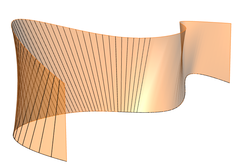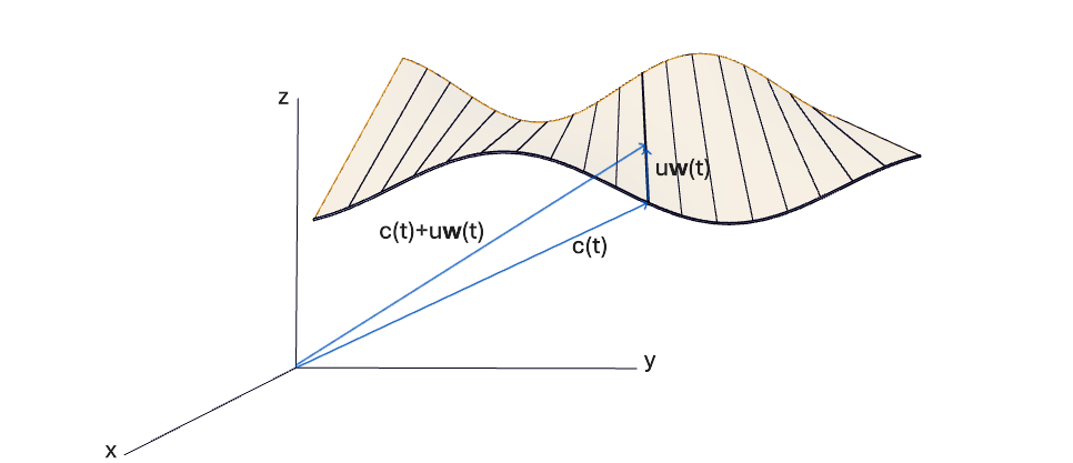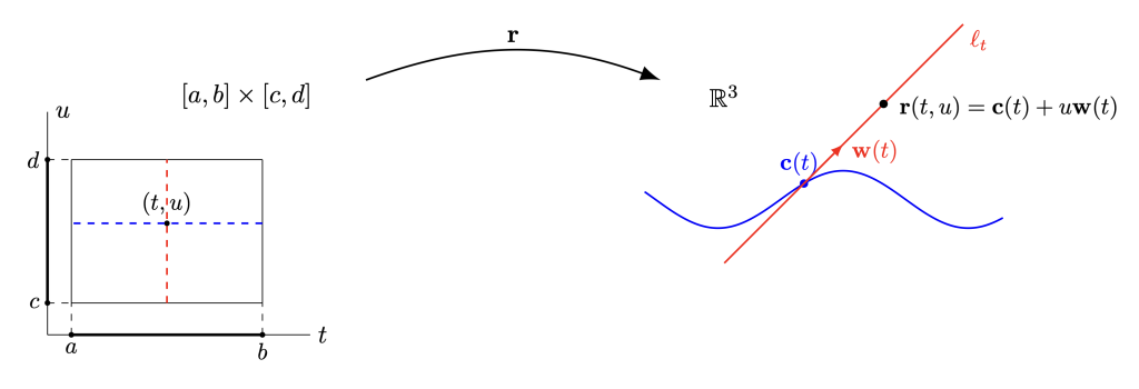 \mathbf{r}(t,u)=\mathbf{c}(t)+u\mathbf{w}(t),\quad t\in[a,b]\subseteq\mathbb{R},\quad u\in\mathbb{R}, \quad(1)