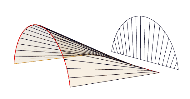 Veamos cómo la geometría de una superficie reglada condiciona la construcción de la misma. Destacamos dos cuestiones clave: línea de estricción y torsión geodésica. La primera está relacionada con la distancia entre generatrices adyacentes (que condiciona el ancho de las láminas en el caso en el proyecto se realice con láminas de madera) y la segunda nos indica si la superficie se puede hacer o no con una hoja de papel. Para analizar esta segunda cuestión necesitamos estudiar el concepto de curvatura de una superficie.
