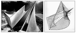 Volviendo al Pabellón Phillips (Figura 16) observamos que las rectas generatrices de las cubiertas no son paralelas a ningún plano. En este caso la superficie reglada está formada por rectas apoyadas a intervalos proporcionales sobre dos curvas trazadas por el arquitecto. En la Figura 17 se observa cómo dichas curvas guía sirven de base para la construcción de pabellón.