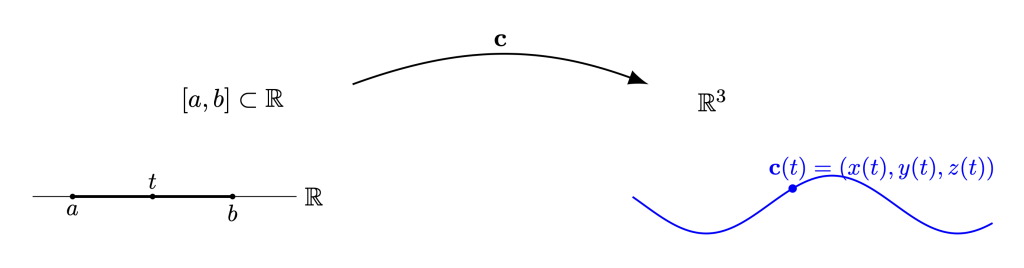 Analíticamente, una curva se describe como la traza de una aplicación \mathbf{c} : [a, b]\subset \mathbb{R}\rightarrow \mathbb{R}^3 que a cada instante de tiempo t \in [a, b]\subset \mathbb{R} le asigna un punto \mathbf{c}(t) en el espacio (Figura 7).