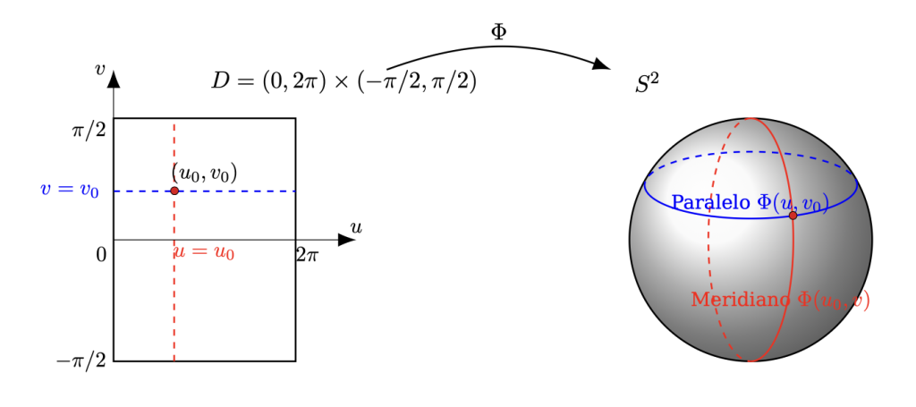 Este tipo de construcción geométrica nos remite al concepto matemático de superficie. Recordamos que una superficie es un objeto bidimensional que puede describirse localmente mediante dos coordenadas. Un ejemplo familiar es la superficie terrestre, cuyos puntos se identifican por su latitud y longitud (Figura 5). Más específicamente, el Pabellón Phillips está formado por un tipo particular de superficies conocidas como superficies regladas, ya que están generadas por una familia de rectas, llamadas rectas generatrices, que se corresponden con los hilos tensados en la maqueta del Pabellón Phillips (Figura 4). Entre los ejemplos clásicos de este tipo de superficie se encuentran el hiperboloide hiperbólico y el paraboloide hiperbólico, que analizaremos con detalle.