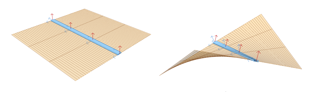 Si materializamos ahora las generatrices como tablones de madera con sección rectangular, observamos que dichos tablones torsionan sobre su eje dependiendo de si la superficie es desarrollable o no (Figura 28). Tal efecto lo mide la variación del vector perpendicular a lo largo de la generatriz y se denomina torsión geodésica. En el caso de una superficie desarrollable, la torsión geodésica de la generatriz es cero (plano en la Figura 29), mientras que en el paraboloide hiperbólico (superficie reglada formada por los segmentos que se apoyan en dos segmentos no coplanarios), la torsión geodésica es no nula y la superficie es no desarrollable.