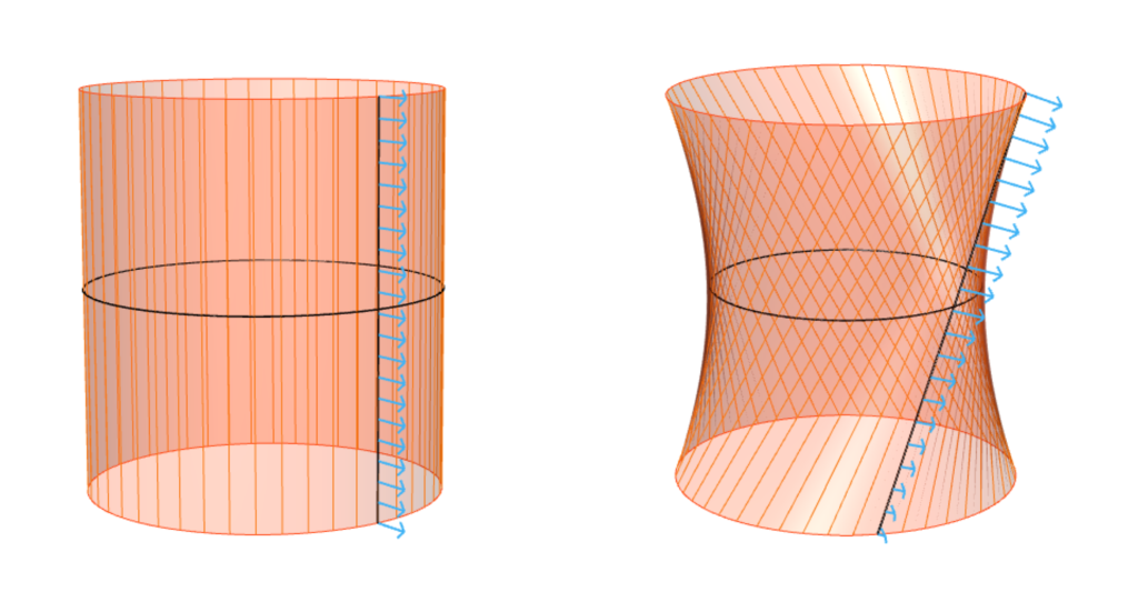 En la Figura 27 se observa que, mientras en el cilindro el vector perpendicular permanece constante a lo largo de una generatriz, en el hiperboloide hiperbólico dicho vector varía conforme se recorre la misma. Esta variación del vector perpendicular indica que la curvatura de Gauss no es nula, lo que implica que la superficie no es desarrollable, es decir, no puede extenderse sobre un plano sin deformaciones. Por tanto, conviene estudiar si el vector perpendicular se mantiene constante a lo largo de cada generatriz.