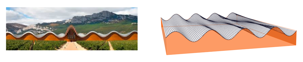 Este último enfoque es particularmente útil para modelar, por ejemplo, la cubierta de las Bodegas Ysios (Figura 15). Las Bodegas Ysios (1998–2001), ubicadas en Laguardia, es una obra del arquitecto Santiago Calatrava que destaca por el uso expresivo de la superficie reglada que forma la cubierta. Observando atentamente la imagen en la Figura 15, concluimos que podemos aproximar la cubierta por una superficie reglada formada por las rectas que se apoyan en dos curvas sinusoidales desfasadas y que son paralelas al plano perpendicular a la fachada. Pongamos